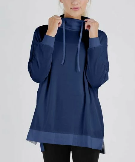 Longline pullover featuring funnel collar, drawstring and split hi-low hem.