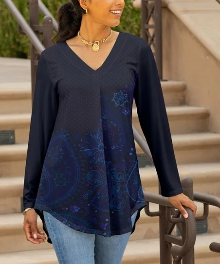 Curate your chilly-weather wardrobe with this long-sleeve tunic designed with a flattering round hem and trimmed v-neck collar.