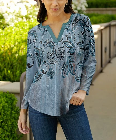 This printed top is designed with a notch neckline and three-quarter sleeves.