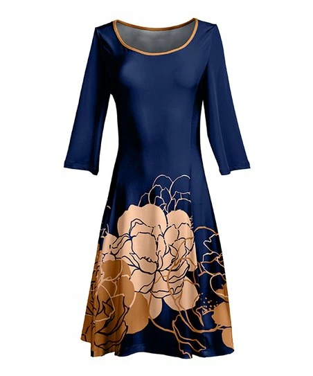 Update your wear-everywhere wardrobe with this patterned A-line dress featuring a hint of stretch fabric and three-quarter length sleeves for comfortable season-spanning style.