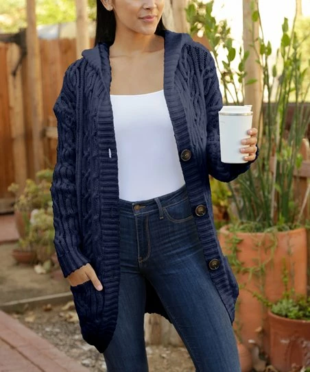 This longline cardigan is a classic treat with a traditional cable knit pattern, handy pockets and a warmth-extending hood.