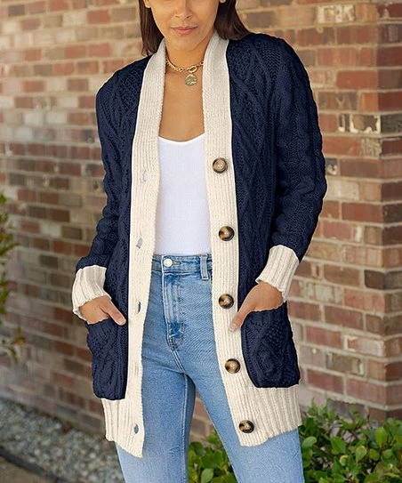 Add a soft layer to your cool-weather ensembles with this thigh-grazing cardigan. A classic cable knit and dark buttons add timeless style to this layering piece.