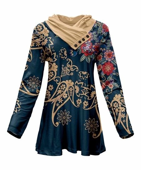 Embody a colorful look in this off-center button-trimmed cowl-neck tunic featuring stretch-infused fabric and a detailed print.