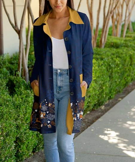 Wrap yourself in the lightweight warmth of this fashion-forward car coat featuring an eye-catching print and contrasting colors at the collar and cuffs. A touch of stretch fabric ensures a comfortable fit.