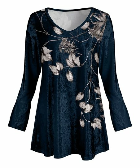 Smooth stretch-blend velvet keeps you comfy when you don this v-neck tunic adorned with a floral print.