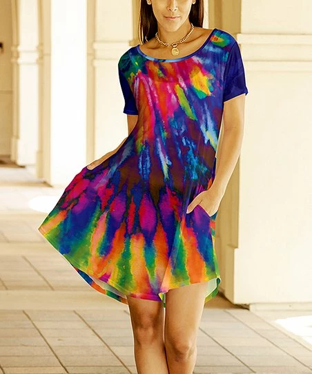 Breezy swing-style midi dress featuring a boatneck, coveted side pockets and an abstract tie-dye pattern.