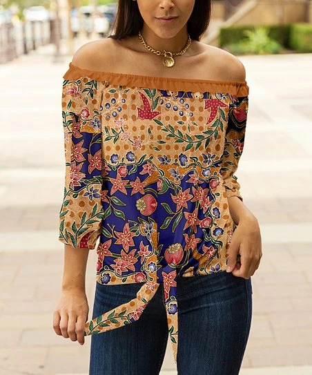 Three-quarter sleeves offer coverage and create balance on this off-shoulder top that has a tie at the center hemline.