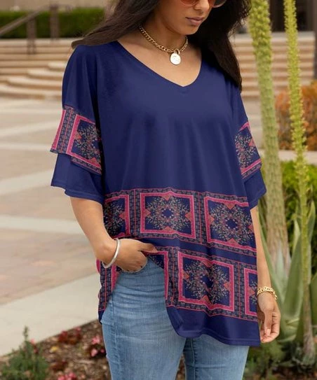 Elevate your casual wardrobe choices with this versatile tunic featuring a fashionable print, layered short sleeves and a comfortable stretch-infused fit.