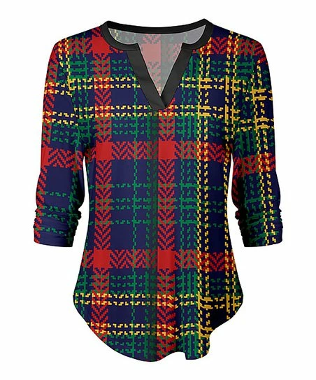 Go for statement style in this patterned tunic featuring a casual notched neckline and stretch-enhanced material.
