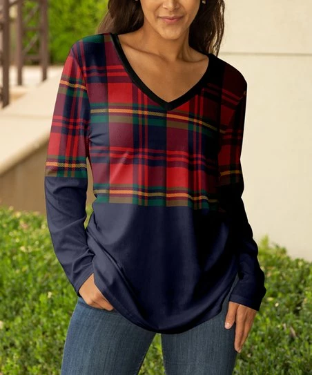 This tunic features a comfy v-neck and long sleeves while making the most of a bold print.