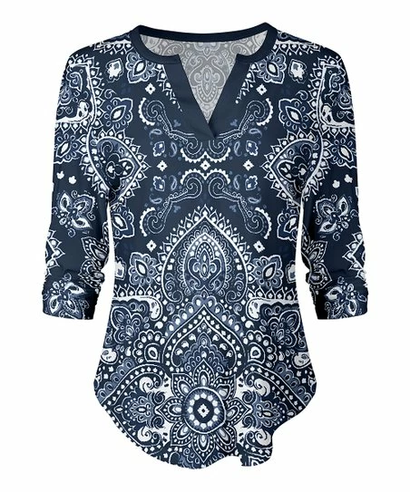 Casual long-sleeve notch neck top featuring an arabesque pattern and curved hem.