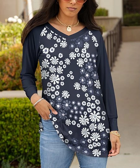 This long-sleeve tunic features a flattering V-neckline and stretch-infused fabric.