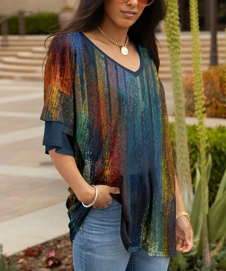 Create an effortlessly chic look with this v-neck tunic that features layered ruffles on the half-sleeves to complement the flowy profile.
