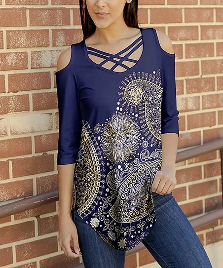 Add a dash of allure with this three-quarter sleeve tunic made with stretch-infused material and a curved hem. A crisscross scoop neck and shoulder cutouts complete the look.