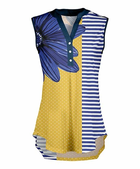 Beat the heat in standout style wearing this boldly patterned tunic that features a sleeveless design and get-noticed print. Buttons liven up the v-neck, and a dolphin hem brings it to a curvy conclusion.