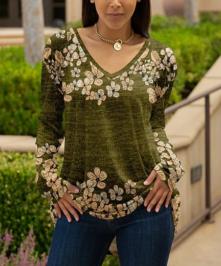 Pair your favorite jeans with this boldly patterned tunic that’s styled with cozy long sleeves and a generous v-neck.