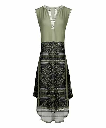 Dress up your casual look with this contemporary dress sporting a trailing hi-low hem and a notched neckline.