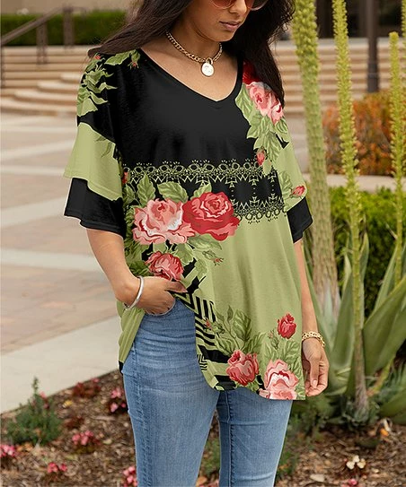 Breeze through your day making a lively style statement in this flowing v-neck tunic that features ruffled sleeves and a blooming print.