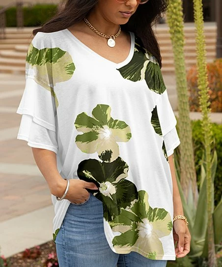 Get a little extra coverage on this v-neck tunic with its double layered sleeves. The top is made from a soft and slightly stretchy fabric.
