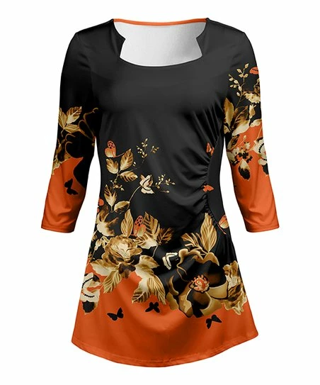 A notched square neck and side-ruched panel bring a modern vibe to this patterned three-quarter sleeve tunic.