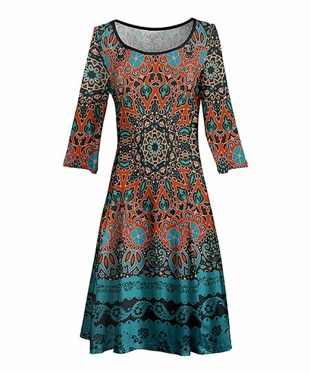 Enjoy this swingy A-line dress featuring a boatneck, three-quarter sleeves and a vibrant print.