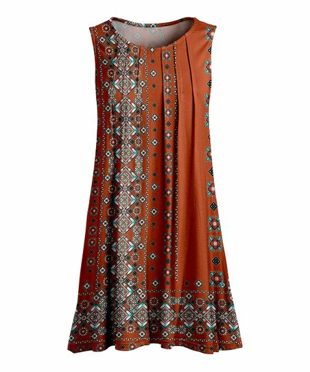 Pleats at the neckline add character to the flow of this sleeveless tunic decorated with an upbeat pattern that lends vitality to your look.
