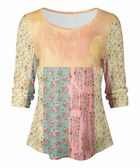 Grab your favorite leggings or jeans to pair with this vibrant three-quarter sleeve top.