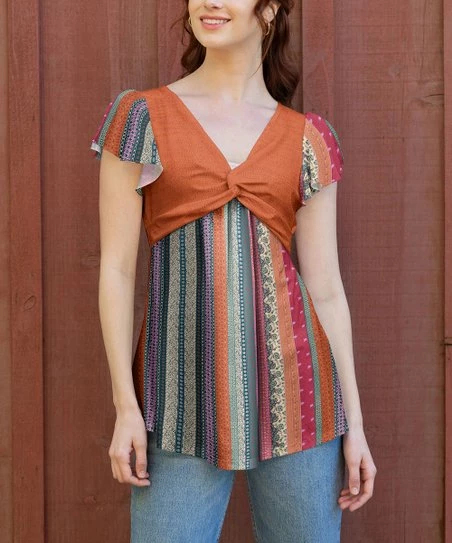 Flowy tunic with contrasting patterns, ruffle sleeves and a center-knotted v-neckline.