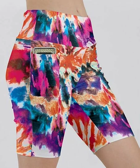 Keep your warm-weather look casual and comfortable with these stretchy bike shorts featuring a wide waistband, a splashy tie-dye print, and a handy pocket to keep your phone and other essentials close at hand.