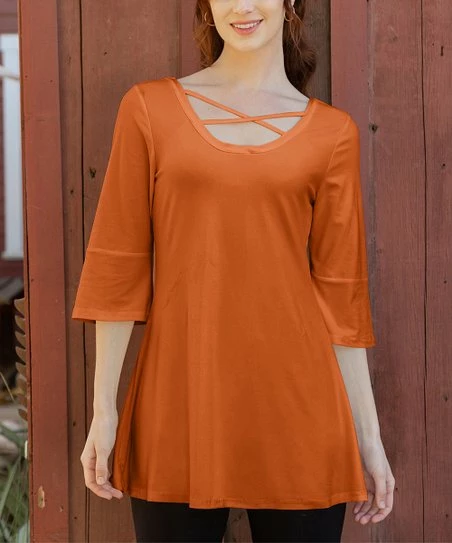 A strappy crisscrossing detail draws attention to the scoop neckline of this flowy tunic. Three-quarter trumpet sleeves.
