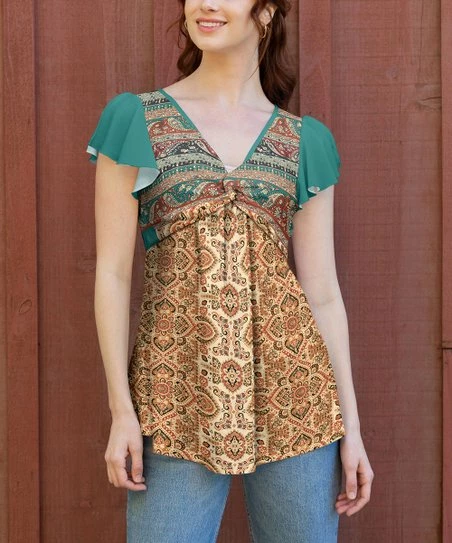 Flowy tunic with contrasting patterns, ruffle sleeves and a center-knotted v-neckline.