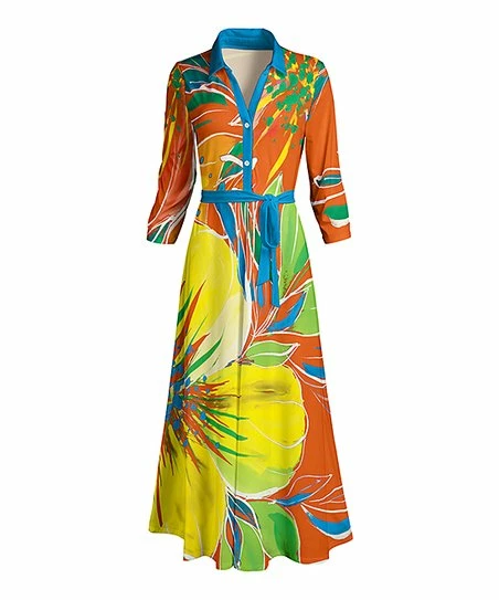 Exude graceful poise in this sweeping shirt dress flaunting a whimsical pattern. A tie at the waist highlights your form and stretch-blend material keeps this look comfy.