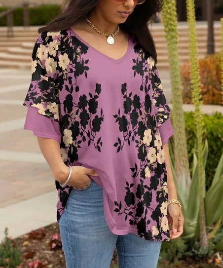 This v-neck tunic flaunts layered ruffle sleeves and a showstopping print.
