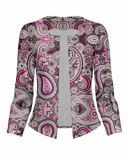Add a chic touch to your work wardrobe with this stretchy collarless blazer featuring a playful pattern and breathable open design.
