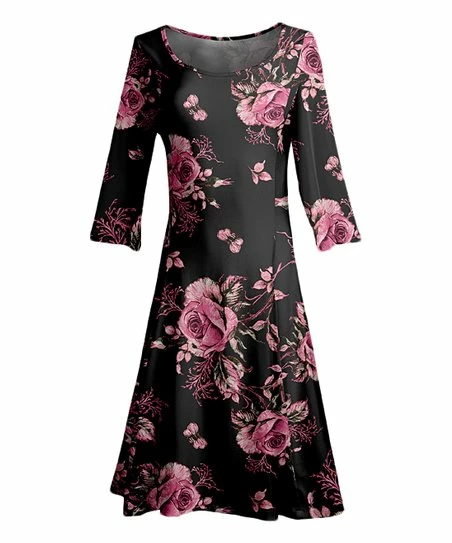 Enjoy stretch-blend comfort and snazzy style with this bold dress sporting a classic fit-and-flare silhouette that complements your curves and a lively, eye-pleasing print. Versatile three-quarter sleeves make this a go-to pick from season to season.