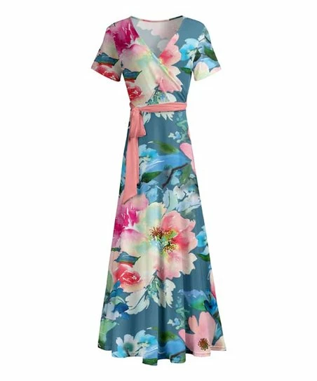 This charming floral maxi dress features an adjustable waist sash and stretch-enhanced fabric.