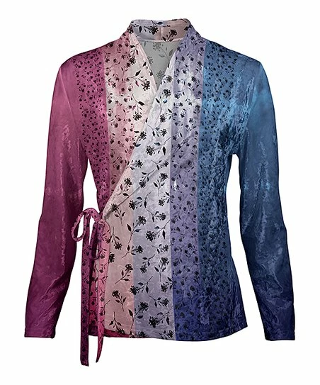 A playful, unique print and stretch-enhanced fabric lend flattering appeal to this velvety wrap-top.