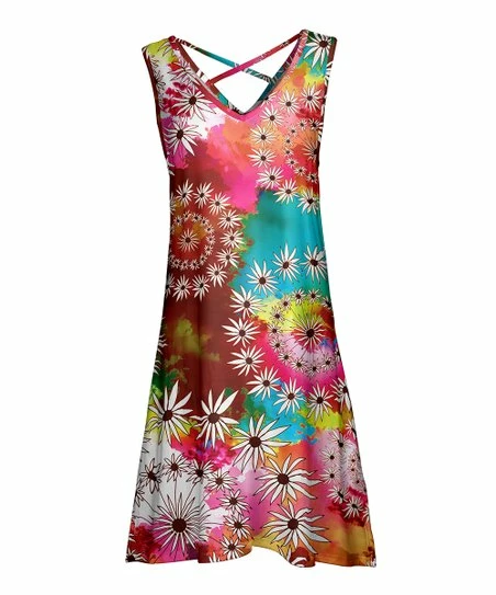The crisscross back detail on this sleeveless A-line dress mirrors the v-neck for a balanced look.