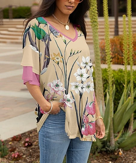 A layered sleeve sparks interest with a fluttery effect that makes this bold v-neck tunic even more inviting and welcome in your wardrobe.