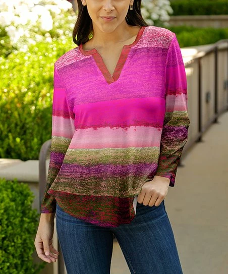 This printed top is designed with a notch neckline and three-quarter sleeves.