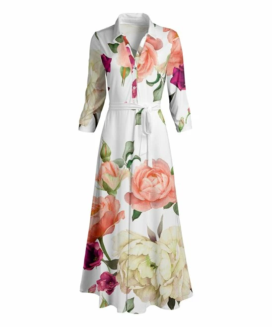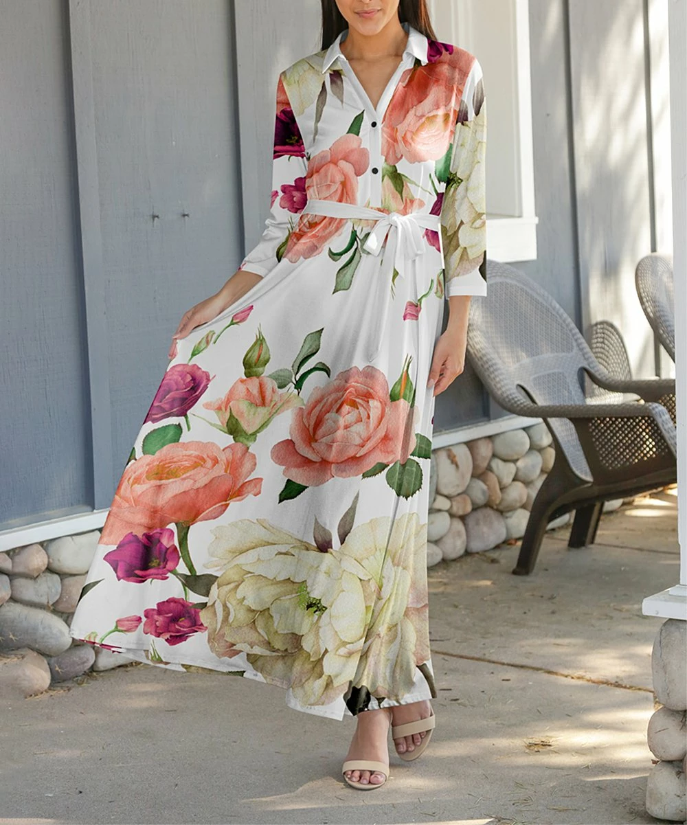 A sophisticated button-up bodice is cinched with a tie-waist sash in this maxi dress made with a floral stretch fabric.