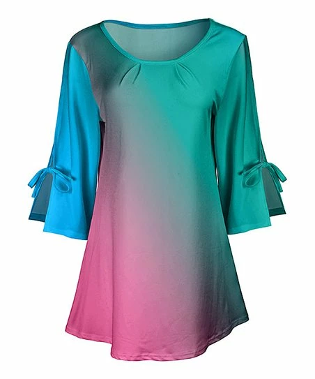 Add a playful style to your everyday wardrobe with this stretch-enhanced tunic sporting flowy bell sleeves accented with charming bows.