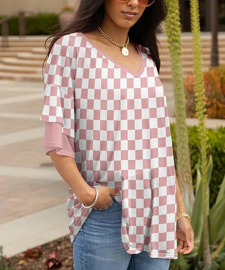 Take on the day with this stretch-infused tunic featuring a checkerboard print and layered sleeves.