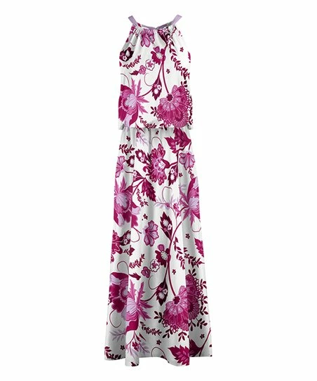 A blouson maxi dress presenting a shoulder-flattering ruched neckline and a statement print.
