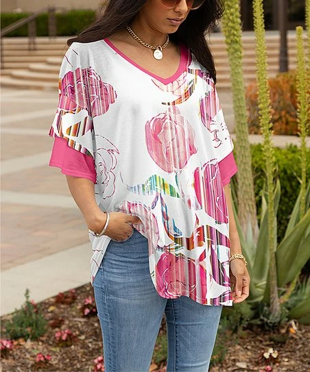 Breeze through your day making a lively style statement in this flowing v-neck tunic that features ruffled sleeves and a blooming print.