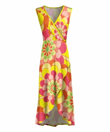 Float through the day in this sleeveless maxi dress with a surplice top and asymmetrical tulip hem.