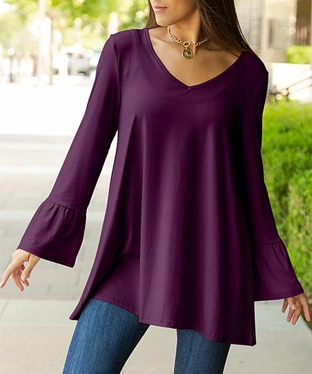 Breeze through your day in the fresh fit of this V-neck tunic featuring flared bell sleeves and stretchy knit fabric for comfortable style that pairs seamlessly with jeans or leggings.