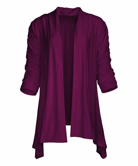 Stretchy fabric keeps you comfy when you don this cozy open cardi sporting fashion-forward sidetails and ruched three-quarter sleeves for added flair.