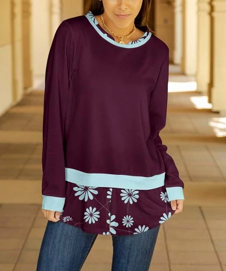 Infuse your casual wardrobe with always-comfy charm when you add this sweater tunic that flaunts a floral-hem design and a soft, stretch-infused fabric.