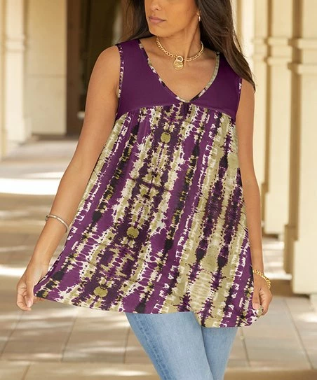 Slip into this sleeveless tunic with a patterned design and flowing swing shape.